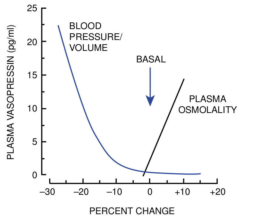 Regulación de la liberación de hormona antidiurética (ADH) en respuesta a estímulos osmóticos (línea negra) y al volumen circulante efectivo (línea azul).